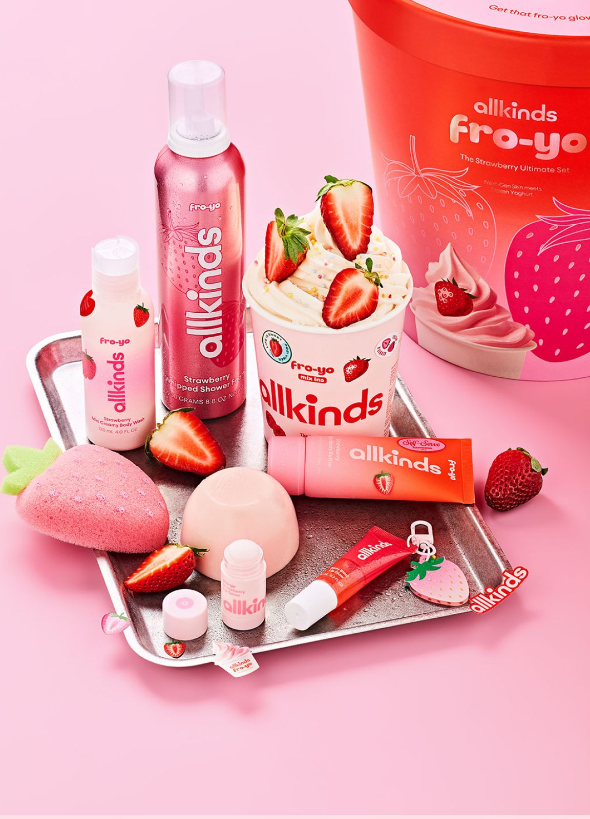 Pink banner promoting Allkinds e-gift cards with text "can't decide? send an e-gift card" and four phones displaying gift card designs for beauty products, drinks, and desserts.Three phones display Allkinds e-gift cards with text "can't decide? send an e-gift card" and "Shop e-Gift Cards".