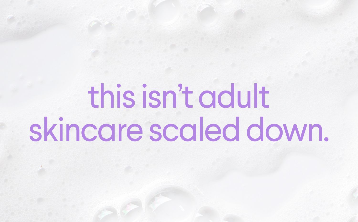 Text that says "this isn't adult skincare scaled down" on a white bubbly background.